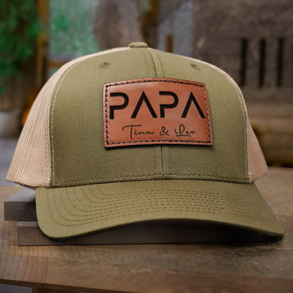 Personalized PAPA Leather Patch Trucker Hat with Kids Names Father's Day Gift New Dad Gift