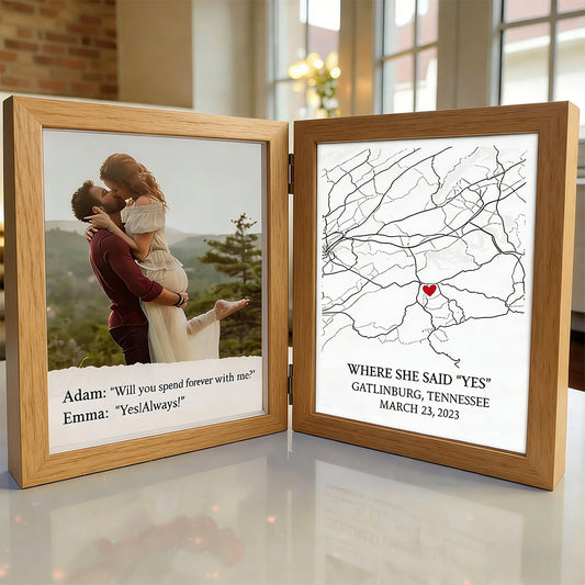 Personalized Bi-Fold Engagement Map & Photo Frame: Custom "Where She Said Yes" Proposal Location Shadow Box – Romantic Anniversary Gift for Couples