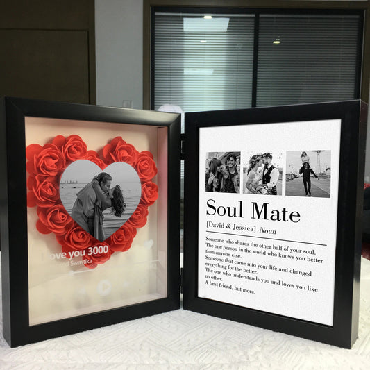 Personalized "Soul Mate" Definition Shadow Box: 3D Rose Heart Photo Frame with Scannable Spotify Music Player – Custom Anniversary & Wedding Gift for Couples
