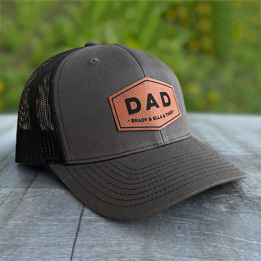 Personalized DAD Hat with Kids Names Leather Patch Trucker Hat Father's Day Gift New Dad Gift