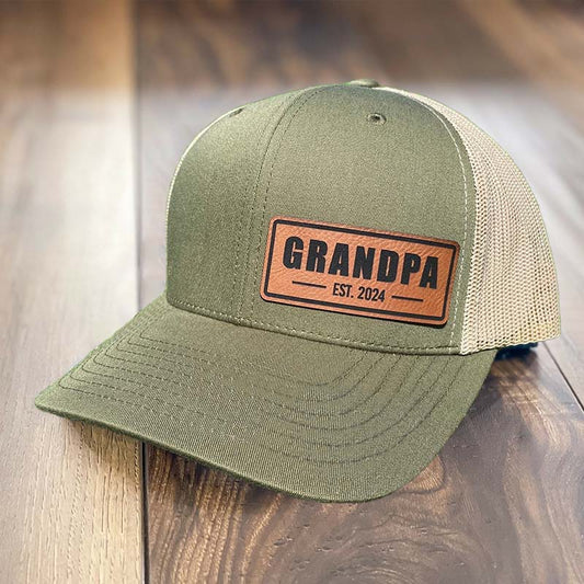 Personalized GRANDPA Est Hat Leather Patch Trucker Hat