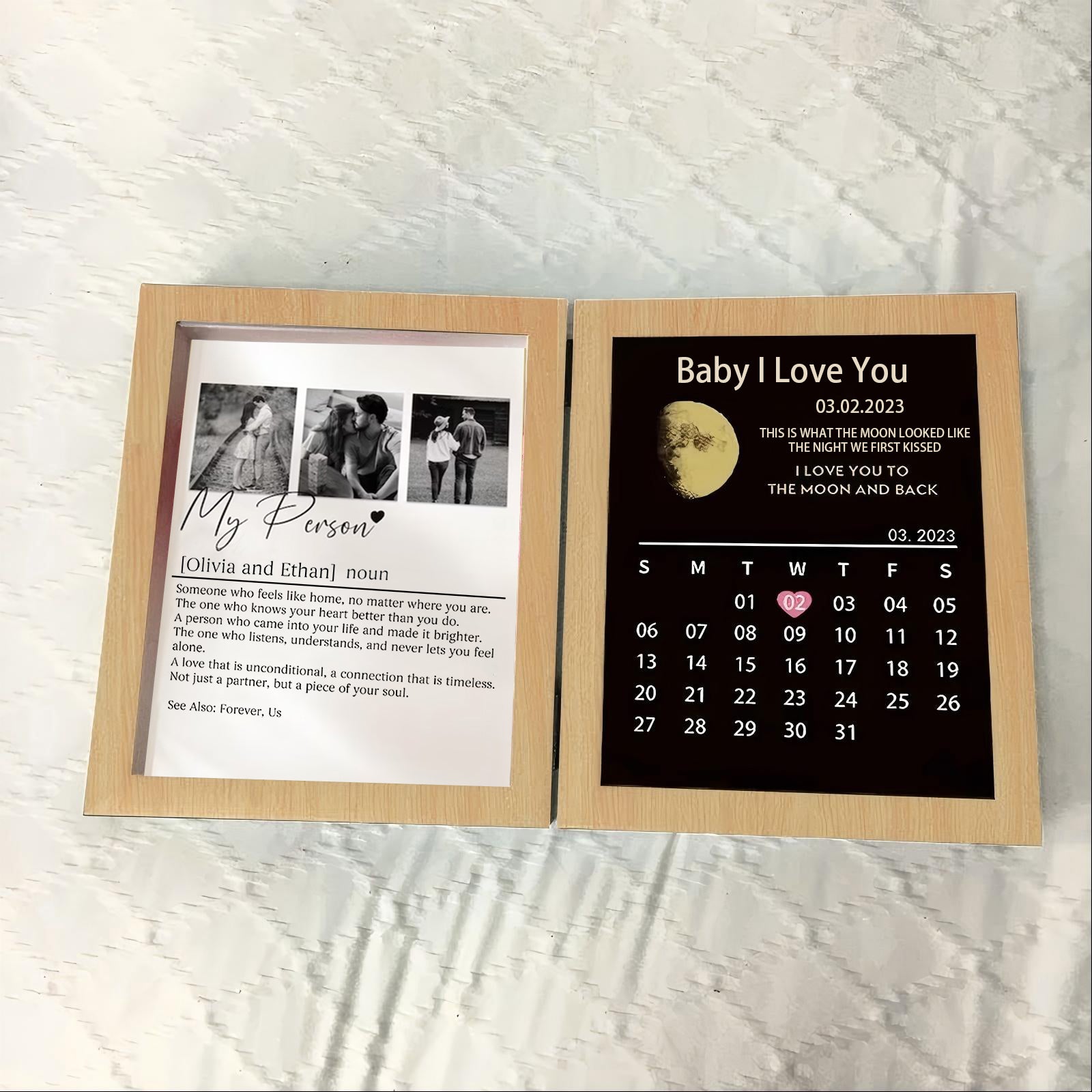 Personalized Bi-Fold Moon Phase & "Soul Mate" Definition Shadow Box: Custom "The Night We First Kissed" Moon Map & Anniversary Calendar Photo Frame