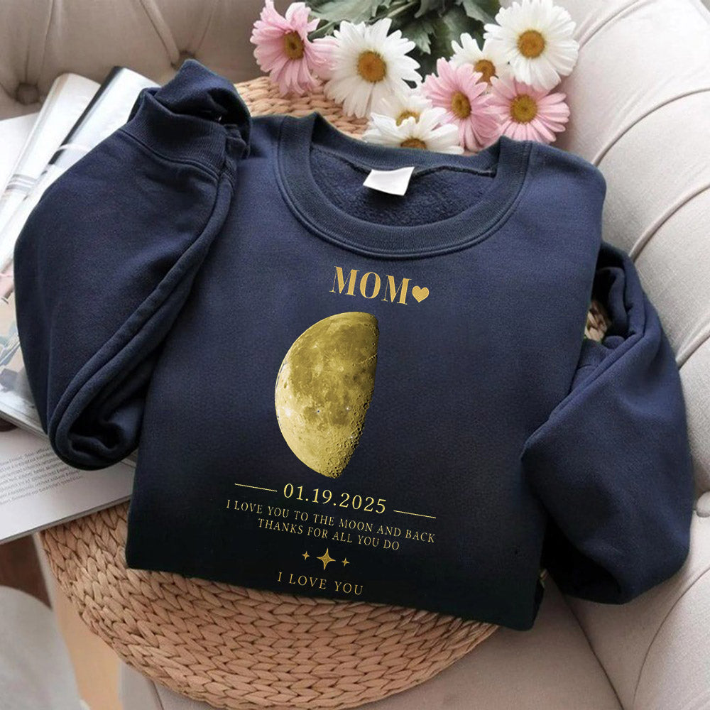 Each moon phase represents the birth dates of family members, creating a custom moon phase sweatshirt or hoodie that tells a unique story. The comforting personalized message adds a personal touch that Mom will cherish forever.