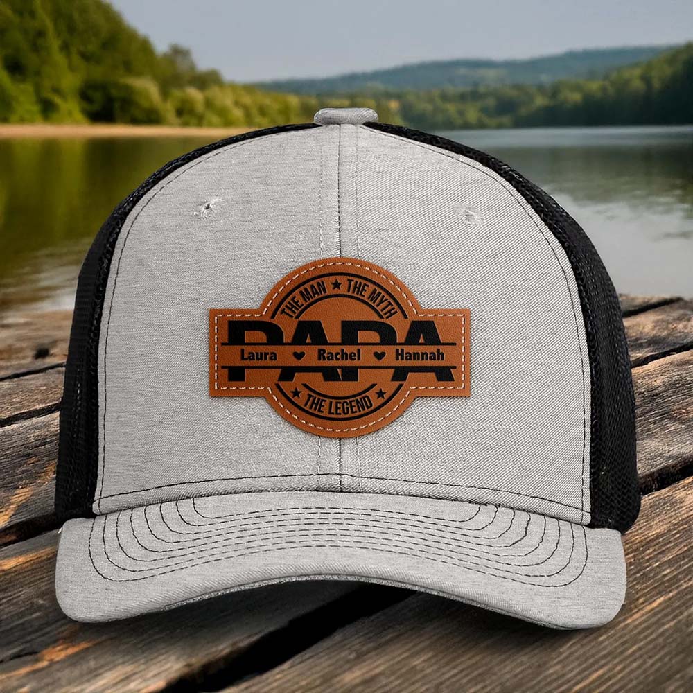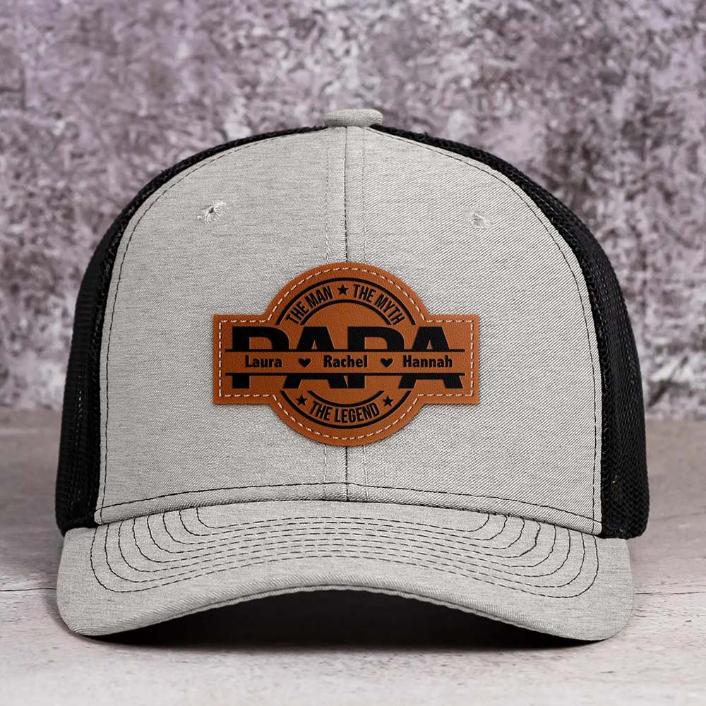 Personalized The Man The Myth The Legend DAD Hats with Kids Names Leather Patch Trucker Hat Father's Day Gift